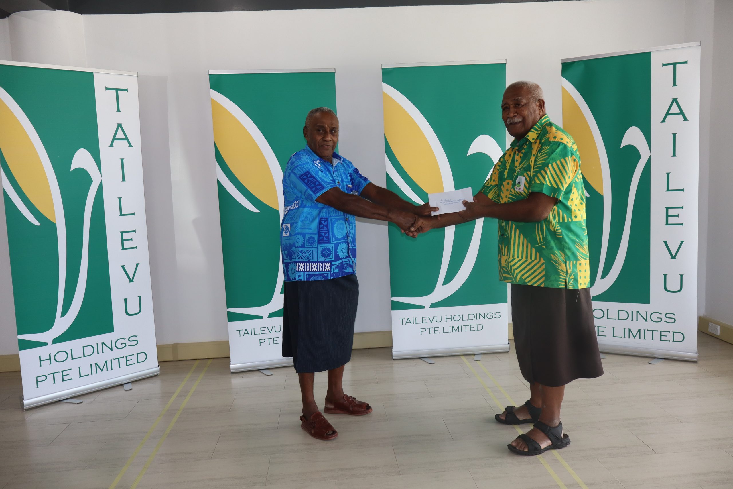 On the left is Ratu Emosi Tuinakelo from Tailevu Holdings handing over the dividend to the Chairman of the Tailevu Provincial Council, Semi Matalau.